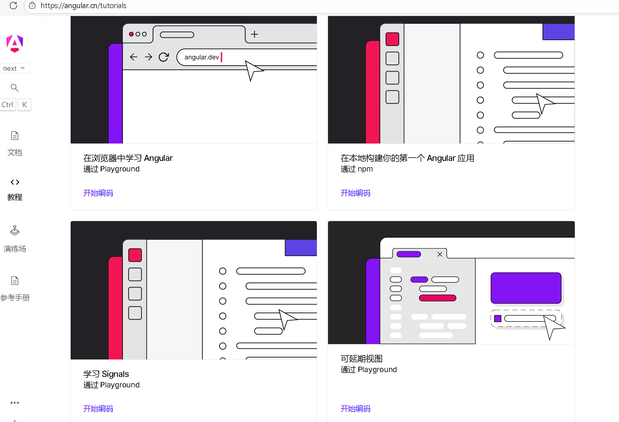 第一个相当于angular的hello world,第二个相当于angular开发环境入门,第三个是类似桌面端的消息学习,消息把多个文件组织起来,前端也有类似机制。第四个是特色功能介绍,性能优化方面。