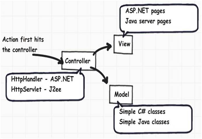 Model, view and controller form the three core pillars for MVC. From 30,000 feet level (That number makes every architect feel good…) below is how these three modules are implemented in each of these technologies:-
