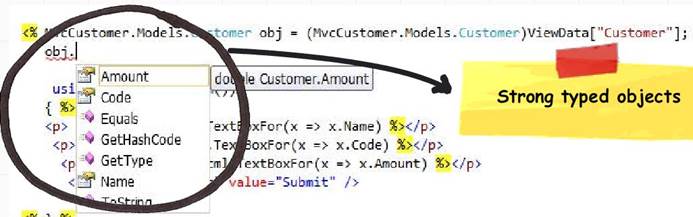 Conclusion: - This feature can look very exciting for ASP.NET community but it was bit amusing for my J2ee friends (I think they are right in lot of sense also). The whole purpose of strong typed views in ASP.NET MVC is for better intellisense which we can be achieved by type casting data from view data object as shown in the below figure. 结论: -这个功能对于ASP.NET社区来说看起来非常令人兴奋,但对于我的J2ee朋友来说这有点有趣(我认为它们在很多方面也是正确的)。ASP.NET MVC中强类型视图的全部目的是为了更好的智能感知,我们可以通过从视图数据对象中类型转换数据来实现,如下图所示。