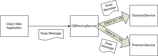 As per the above figure, client web application will consume CBRoutingService. SoapHeader will have user id stored in it. CBRoutingService will route the request to the StandardService or PremiumService based on the user id. If user id is less than 100, then it will route the request to the StandardService otherwise it will route it to PremiumService. So this is simple routing application which we will build.